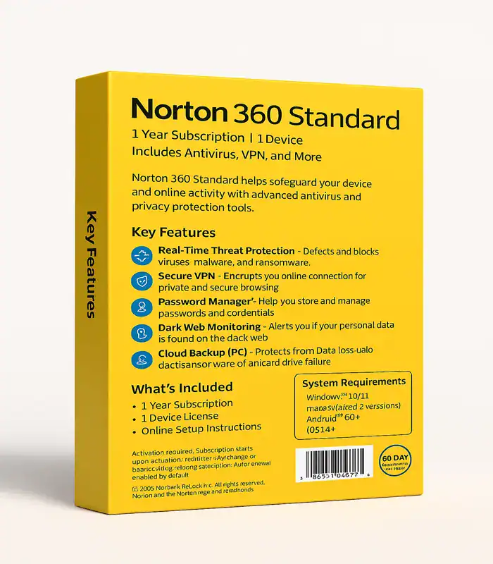 Norton 360 Standard är en komplett och pålitlig säkerhetslösning som ger ett års skydd för en enhet – oavsett om det gäller PC, Mac, smartphone eller surfplatta. Med avancerat antivirus och realtidsskydd hjälper Norton till att stoppa hot innan de orsakar skada och skyddar dig mot virus, ransomware, spyware och phishingförsök.